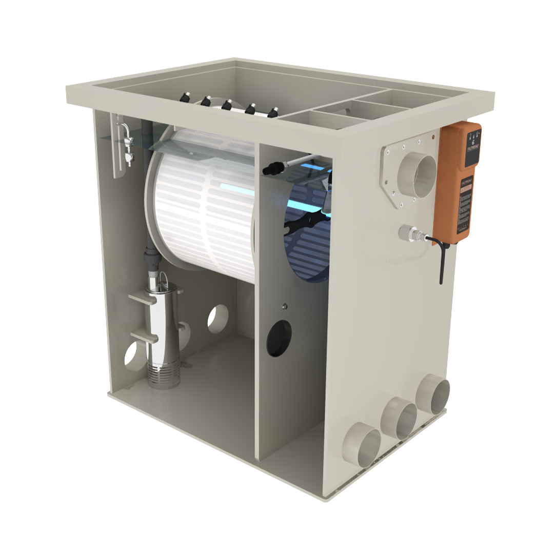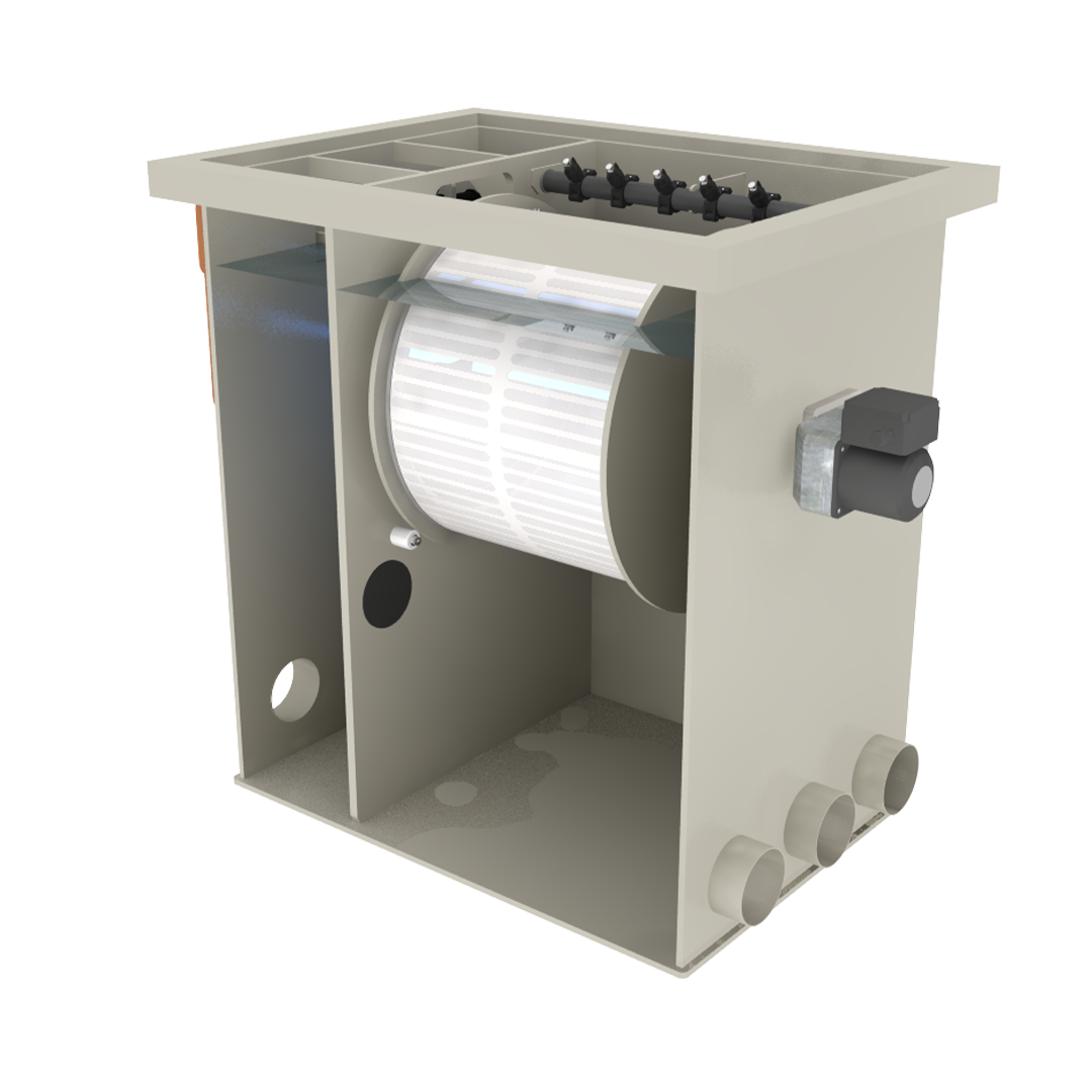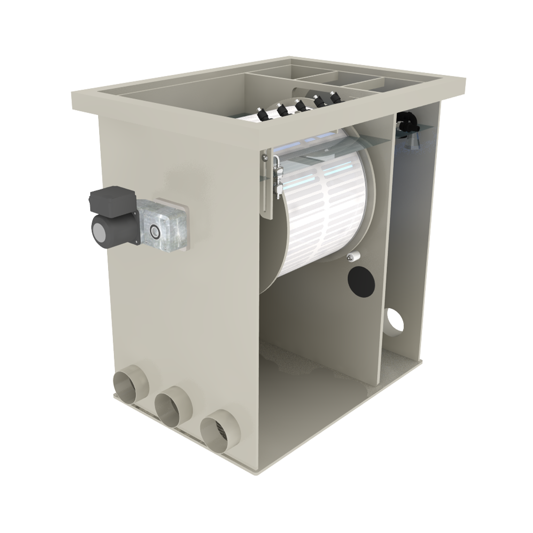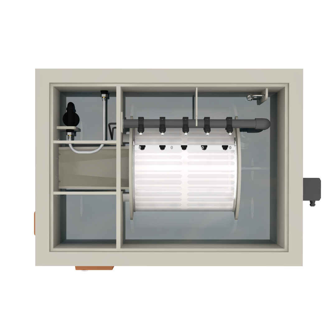 Because of the dirt, the water in the drum cannot flow through the filter mesh as easily. This is signaled by the float switch, which triggers the flush function. This involves the drum spinning. The nozzles then spray water from the outside against the rotating drum.